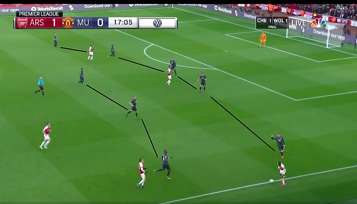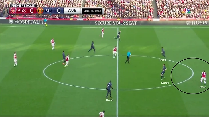 Матч начался со сравнения стартовых планов команд. Сразу стоит сказать, что 4-4-2 Манчестера продержались только 15 минут. Следствием смены схемы стал план Арсенала. Расположение Поля как левого полузащитника несло проблемы Юнайтед во всех стадиях игры. Без мяча у него было два варианта. Первый: отрабатывать за Мэтлейндом-Найлзом и получать мяч в очень глубокой позиции-это сильно вредило продвижению мяча. Второй: начинать прессинговать Сократиса, тогда его поддерживали Матич и Фред, Озил получал свободу между линиями.