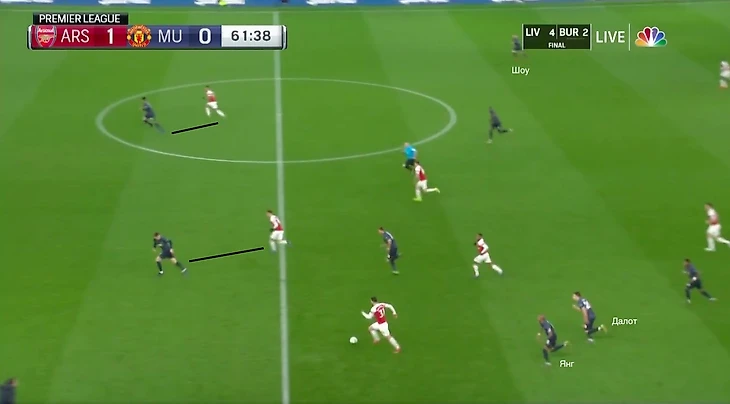 Именно они должны были использовать зоны за фланговыми защитниками Юнайтед(они стали играть ещё выше). Пенальти пришёл именно из такой ситуации(большой вопрос был ли он там вообще). Но после 0:2 Юнайтед не смог эффективно продвигать мяч и создавать моменты. При огромном перевесе владения мячом(63%-37%) почти равное количество касаний в штрафной. Арсенал отлично играл на контратаках, из-за высокого расположения крайних защитников и проблем Янга на этой позиции(иногда он по старой памяти бежал вперёд).