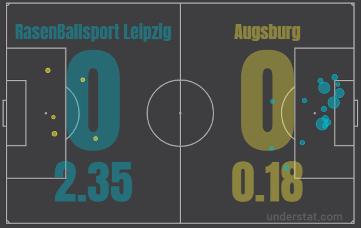 «Лейпциг» забрал себе мяч и всячески контролировал происходящее на поле, периодически пробуя подобраться к воротам соперника – но безрезультатно, собственная точность и уверенная игра вратаря гостей Кобеля не позволили открыть счёт. «Аугсбург» же отвечал агрессивными единоборствами, перехватами мяча и высокой интенсивностью действий.