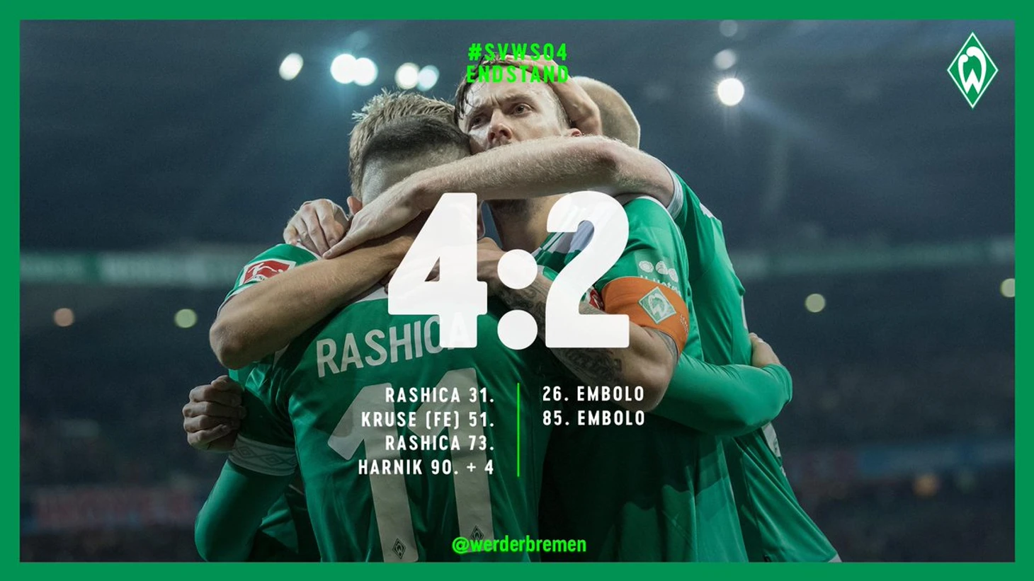 Спустя ещё двадцать минут Рашица снова оказался ровно там, где надо, проскочив мимо всех и воспользовавшись возникшей дырой в пространстве. Несмотря на шаткое положение, «Шальке» не сдался и сократил отставание на 85-й (усилиями всё того же Эмболо), но Харник на последней минуте добавленного времени вбил гвоздь в крышку гроба.