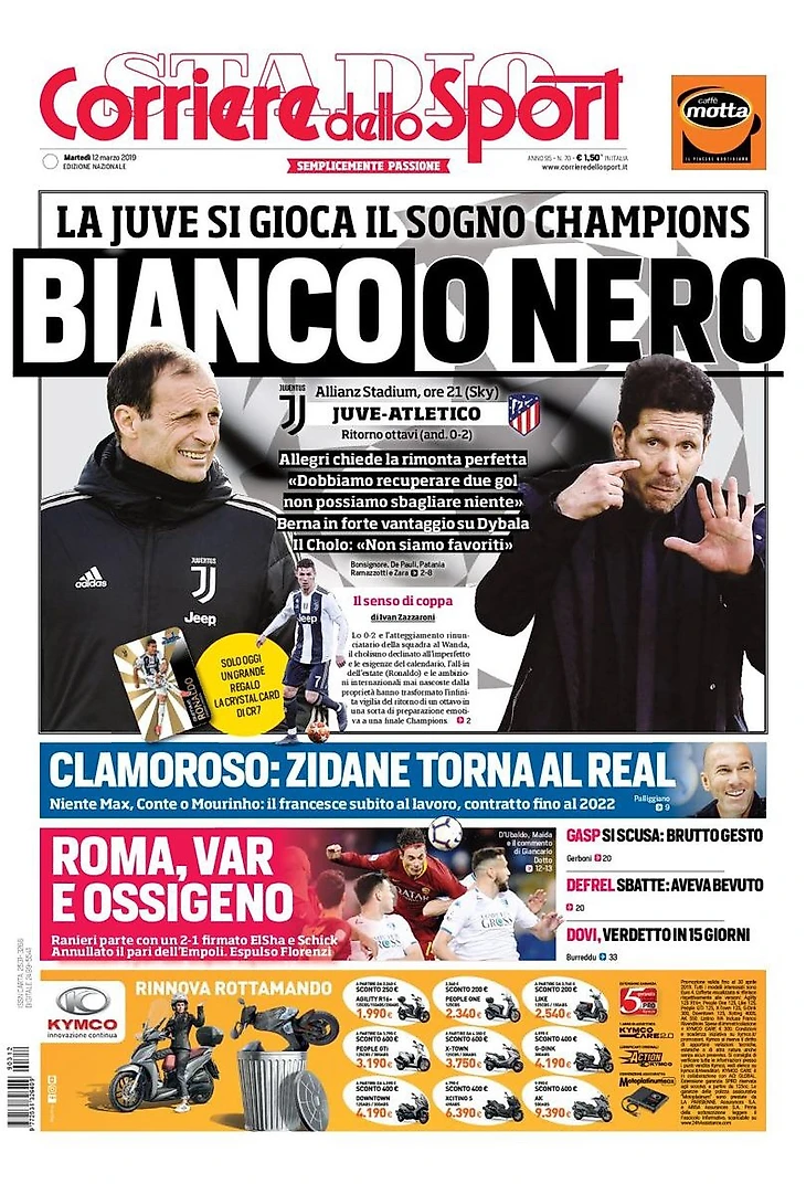 21:00 (CET), матч «Юве»-«Атлетико» стоит прохода в четвертьфинал Лиги Чемпионов. Супер выручка около 5 миллионов, чтобы подтолкнуть Бьянконери к большому камбэку после 2:0 в Мадриде. Дуглас Коста травмирован, Аллегри идёт к 3-5-2. Невероятно: Зидан вернулся в «Реал».