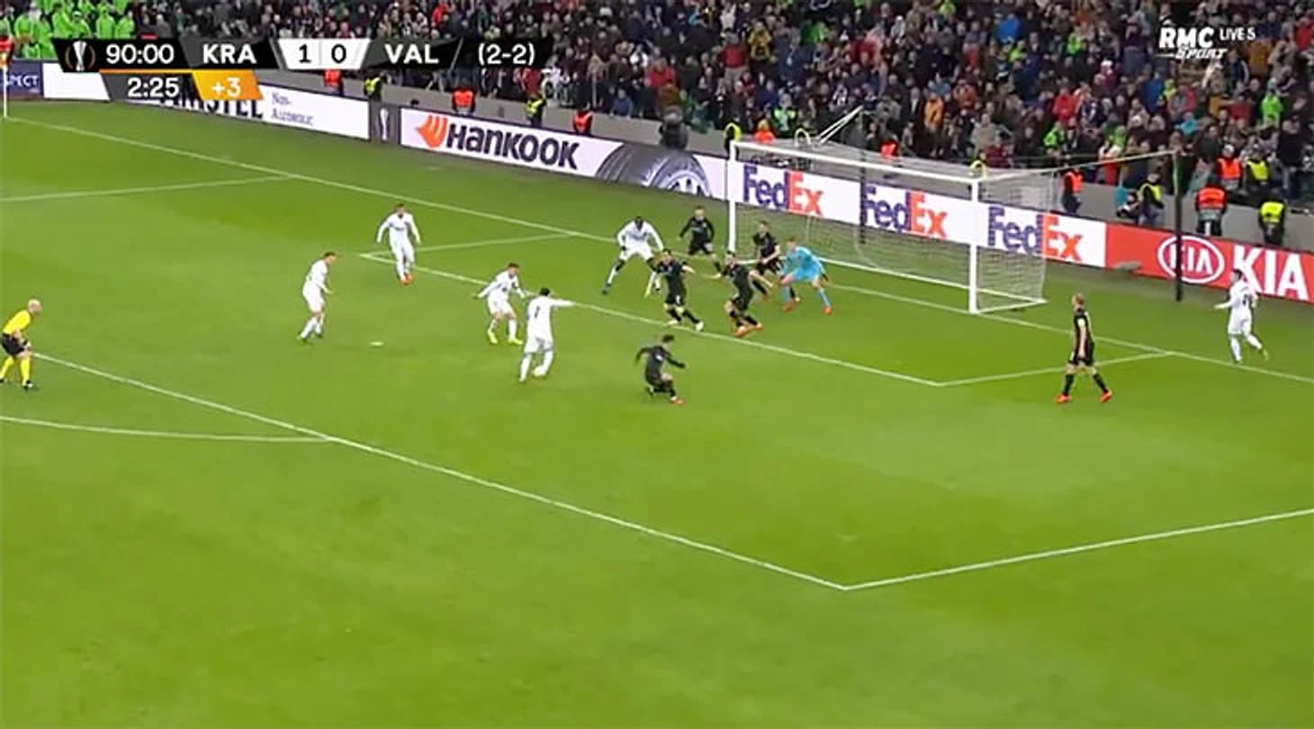 Мы сегодня столько хвалили суперзапасного «Краснодара» Шапи, но сработали и замены «Валенсии». Забрав мяч у Классона, Черышев отдал Коклену, тот отпасовал на вышедшего за пару минут до конца основного времени Гамейро. Свежий француз легко ушел по флангу от игравшего с самого начала Рамиреса и прострелил в штрафную.