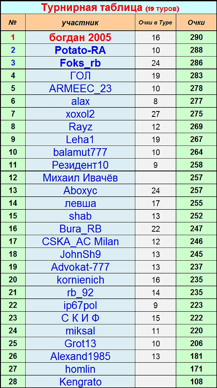 Турниры по прогнозам. РПЛ 2018-2019. Итоги 19 тура