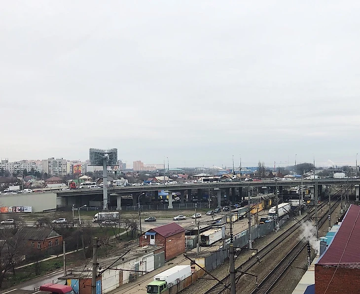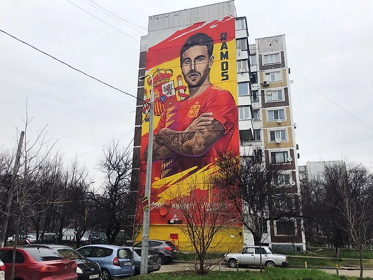 Краснодар находится на равнине, поэтому стадионы – «Кубань» и «Краснодар» – практически не видны. Первый легко находится благодаря олдовым фонарным мачтам, а второй так просто не увидеть. Окраина, железная дорога и обшарпанные развязки максимально изолируют арену. Мы жили на пятом этаже гостиницы с шикарным видом. Если присмотреться, где-то позади Серхио Рамоса видна часть творения Сергея Галицкого.