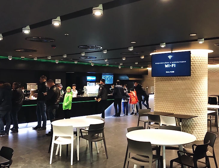 Поразили смешанные зоны для болельщиков на уровне скайбоксов. Две большие ложи открыты для всех. Там можно погреться, выпить чая и поесть, а заодно посмотреть футбол через стекло. На московских стадионах такого точно нет. Ну или есть, но доступно по продвинутым абонементам.