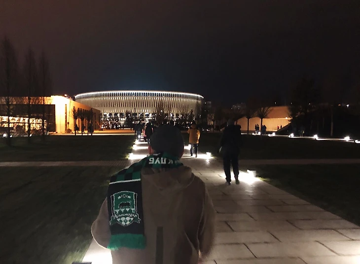 Центр – ухоженный, но мрачный, а заниженными приорами никого не удивишь. Шокирует городская музыка: Красную и другие главные улицы поливают Филипп Киркоров вперемешку с Федуком и Стасом Михайловым. Пройдя по местным барам, мы двинули на футбол: четыре-пять километров из центра пешком. Между частных домов, сплющенных уродливыми панельными многоэтажками, затем мимо стадиона «Кубань» – и мы почти на месте. В темное время суток приходится ориентироваться вслепую. Как понять, что ты уже близко? Где-то за два километра до стадиона из рыхлой земли вырастают дорожки для пешеходов и велосипедистов в собянинском стиле, приятное освещение и чистота.