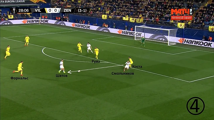 Только вот Смольников расположился слишком узко для приёма мяча. У Дриусси хватило бы времени для перевода в любую точку на правом фланге, где Игорь должен был создавать ширину, а не «висеть» на спине у левого вингбэка «Вильярреала». В итоге Форнальс, Коста и Руиз зажали Смольникова и Шатова в своеобразный треугольник, произошёл отбор и «Жёлтая Субмарина» начала свою голевую атаку.