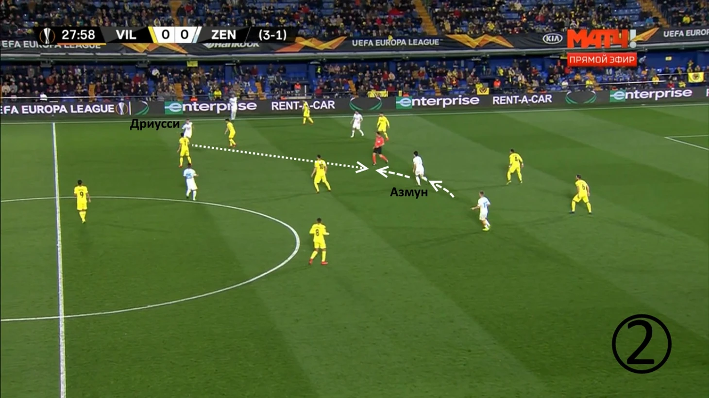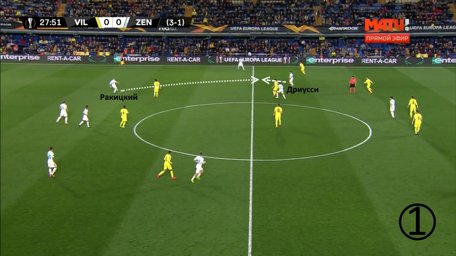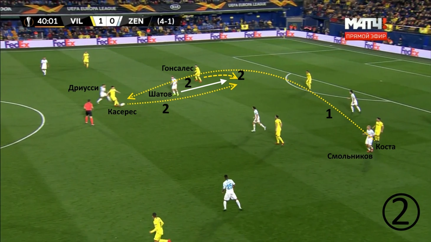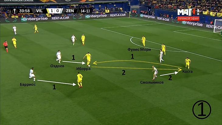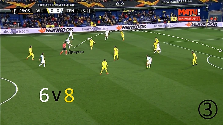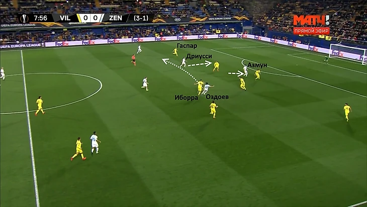 Ракицкий дождался смещения Дриусси в глубину, отдал ему мяч. Себастьян в касание перевёл его Оздоеву, перед которым открылась зона для продвижения. Прессинг-группа «Вильярреала» отрезана.