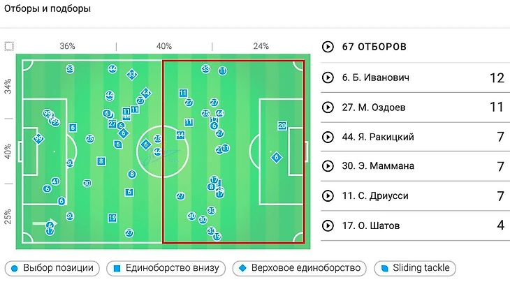 Фаза выхода из-под прессинга в данном эпизоде была продемонстрирована на видео выше. Оздоев опять вышел на оперативный простор, но никто под него не открылся – Дриусси и Азмун бежали за спины, хотя из-за давления Иборры Магомед не мог отдать им плотную проникающую передачу. Он попытался покатить поперёк в надежде, что Себастьян всё же откликнется на этот пас, но аргентинец траекторию движения не поменял и пас был перехвачен Гаспаром.