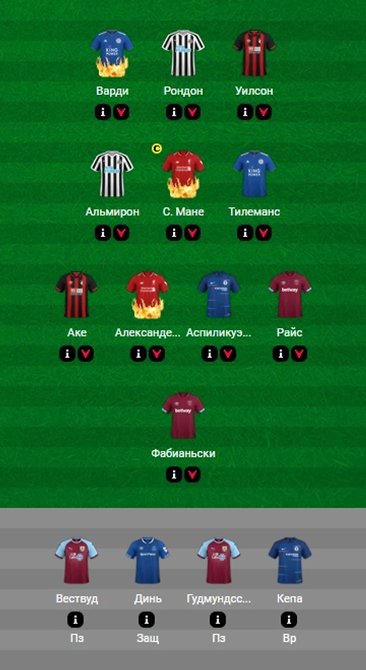 Нападение. Кто точно смотрится прекрасным выбором на этот тур, так это Джейми Варди 8,0, англичанин расцвёл после ухода Пюэля и забил уже 4 гола, один раз не пожадничав и выкатив Тилемансу на пустые ворота. Полагаю Салаха кэпить будут очень многие (возможно зря), так что просто пройдём мимо. Своё возвращение Каллум Уилсон 7,0 отметил 1+1 на пару с Фрэйзером, его гол, одновременно с уровнем обороны Хаддерсфилда можно увидеть тут. Кстати, я бы не стал списывать со счета его оппонентов: Саломон Рондон 7,0 и Айосе Перес 7,0 отлично покуражились во встрече с Эвертоном и имеют положительную статистику в играх с вишнями: 3Г+П в 5 у венесуэльца и 2Г+П в 4 у испанца.