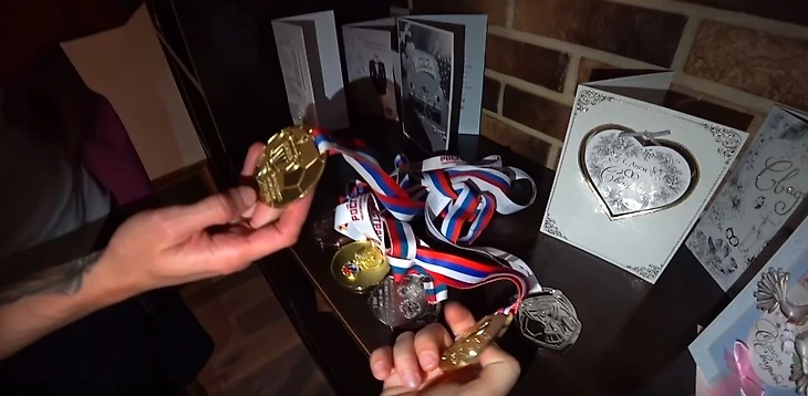 Полка с иконами и трофеями. В руках кубок чемпионов Москвы-1999.