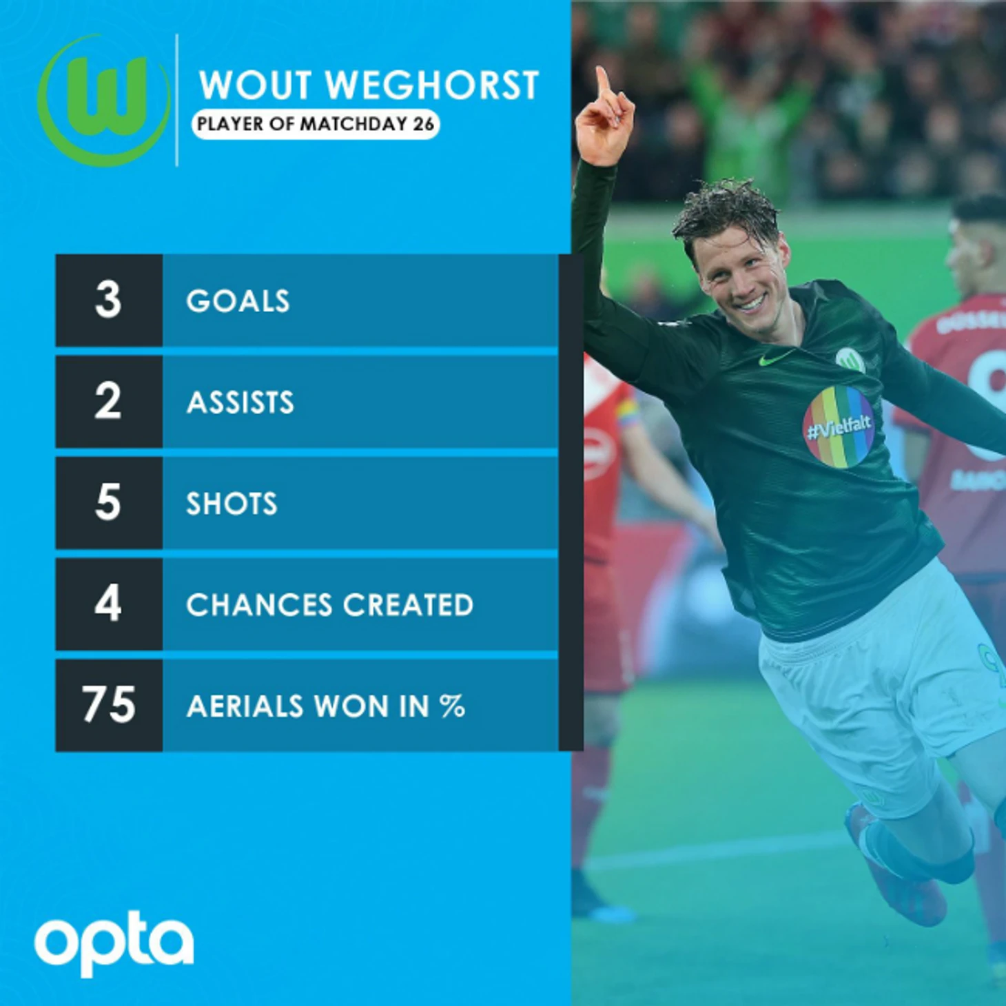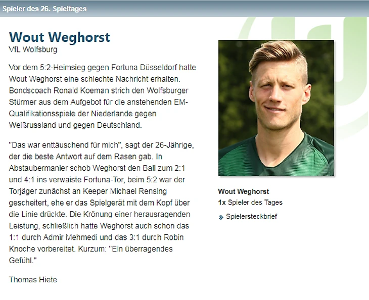 Ваут Вегхорст оформил первый хет-трик в своей карьере. С апреля 2017, когда хет-трик оформил Марио Гомес в матче с «Байером», он первый игрок «Вольфсбурга», забивший 3 мяча в одном матче. Также с 12 голами он лучший бомбардир клуба в текущем сезоне.