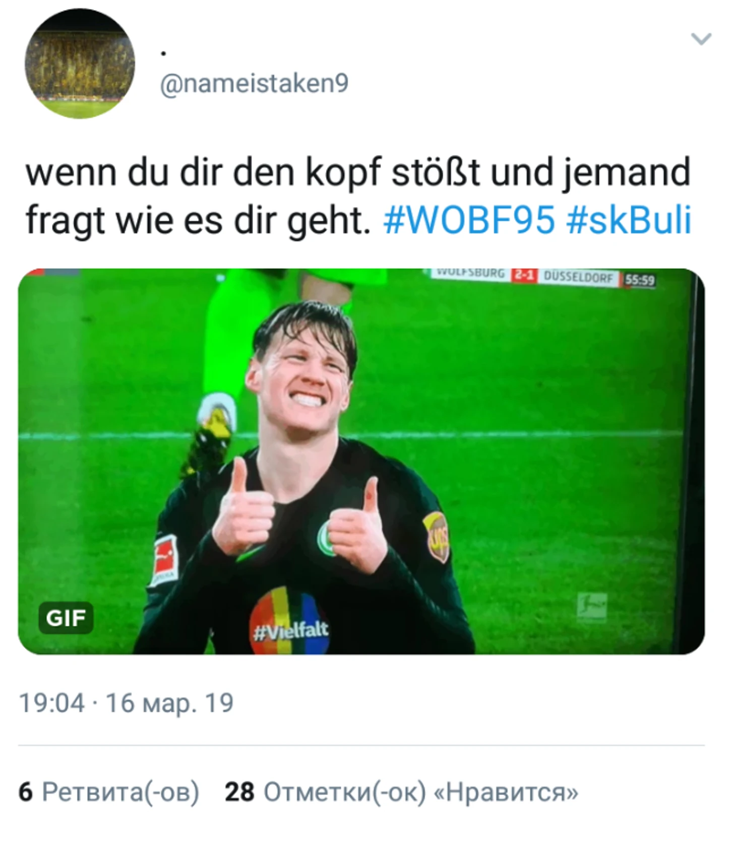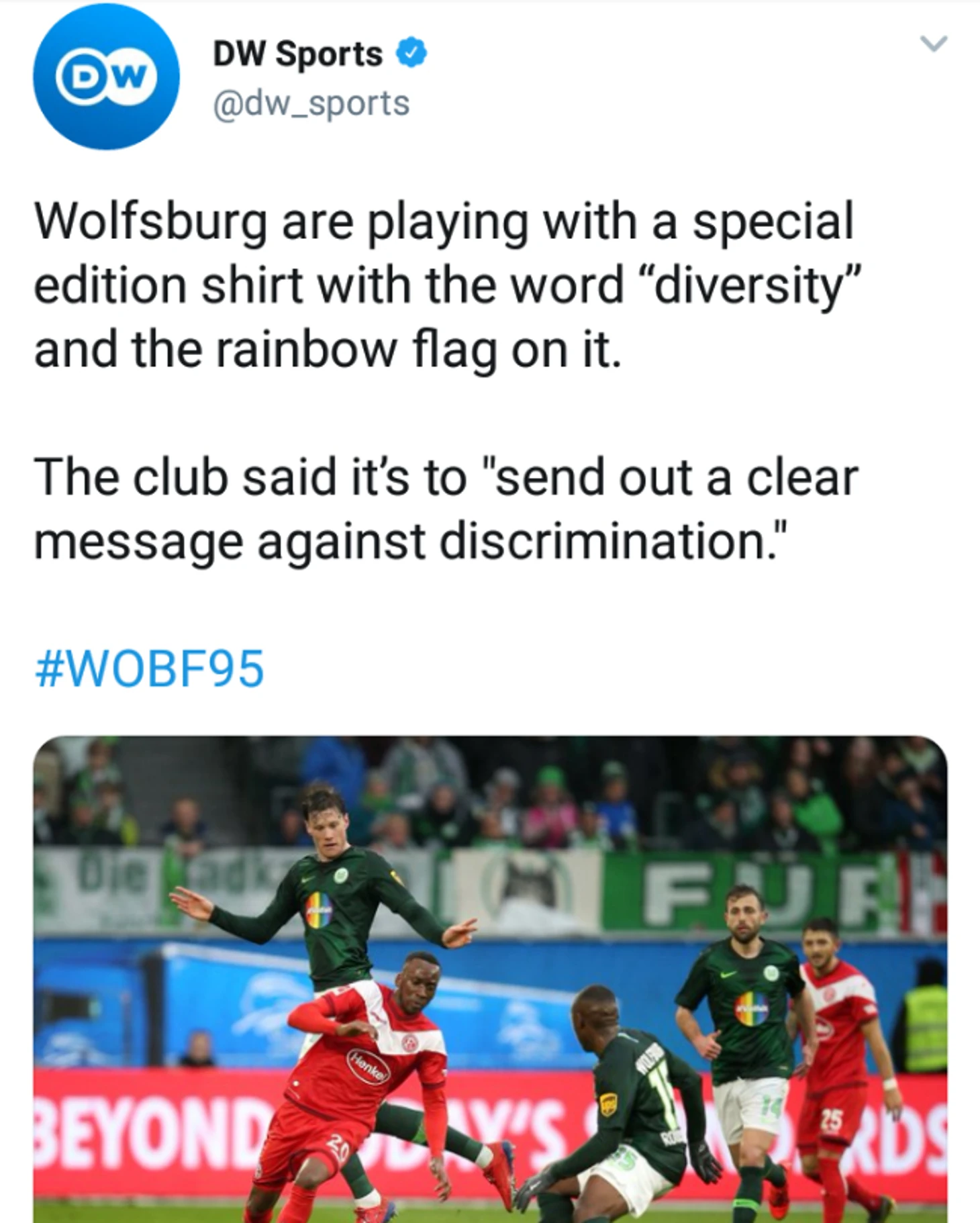 «Вольфсбург» играл в специальных футболках со словом "многообразие" и радужным флагом на груди. Клуб объявил, что это "четкое послание против дискриминации".