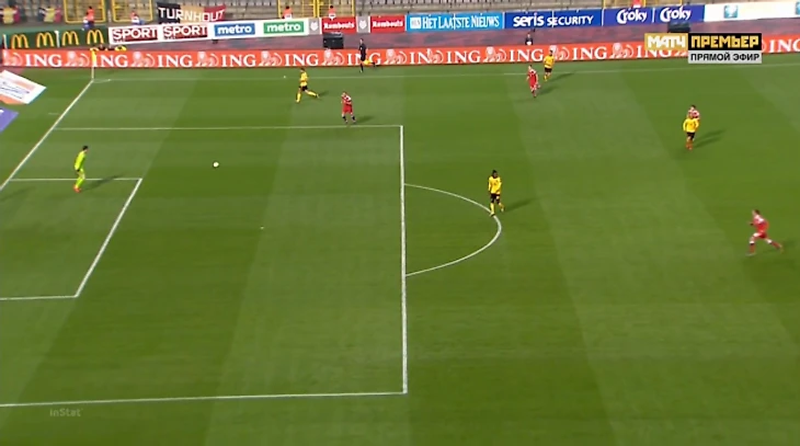 Но Куртуа задержался и попал под дикий прессинг того же Дзюбы. Вратарь даже оступился, часто перебирая ногами.