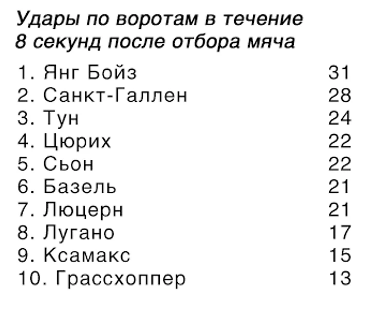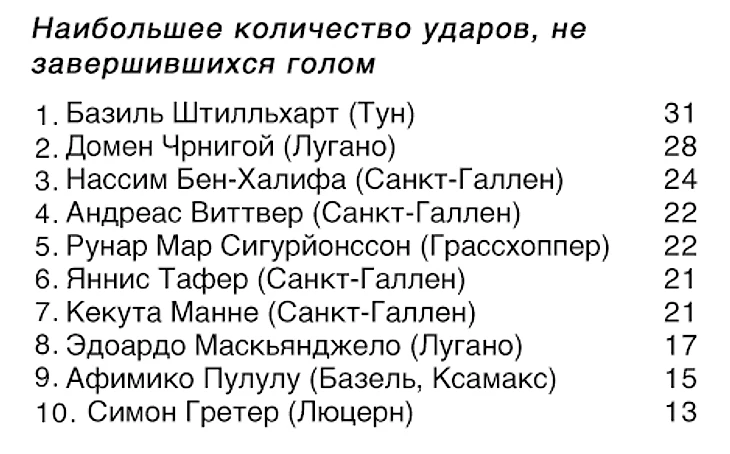 Но есть и оборотная сторона: сразу четыре представителя «Санкт-Галлена» среди игроков, которые чаще всего бьют по воротам, не забивая при этом голы. Это говорит о том, что восточношвейцарцы слишком поспешно ищут завершения.