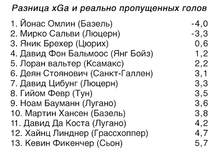 Только два вратаря Суперлиги парировали больше голов, чем должны были статистически: Йонас Омлин и Мирко Сальви. Баланс остальных вратарей лиги минусовой. Это показывает статистика xG с точки зрения вратарей – то есть, сколько вратарь должен был пропустить по данным Opta, и в скольких случаях эти шансы были реализованы. Разница между этими двумя показателями показывает эффективность вратаря. Таким образом, Омлин пропустил на четыре гола меньше, чем в среднем ожидалось, исходя из xG.