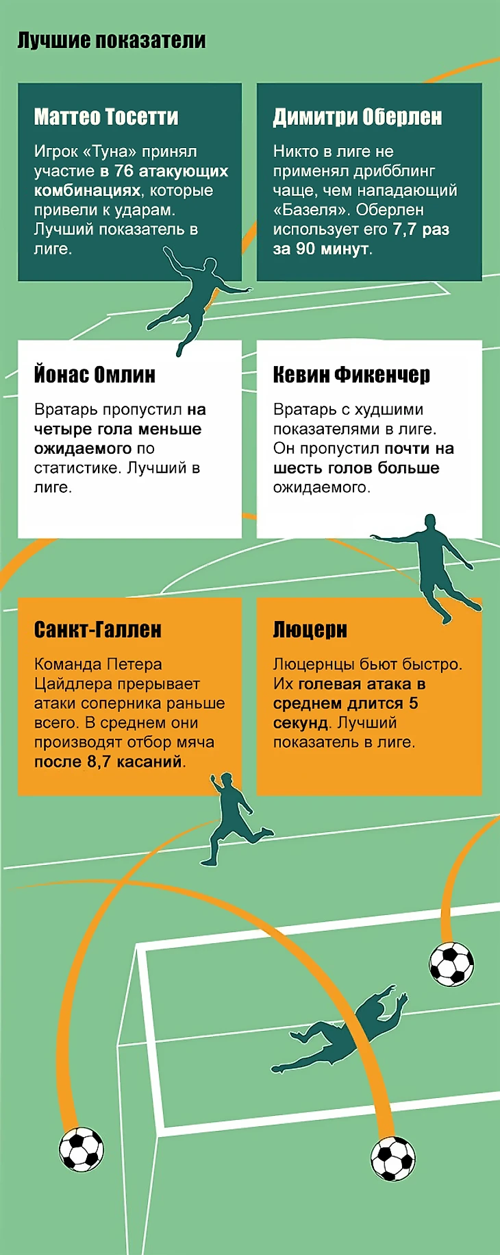 Швейцарские клубы забивают на 24 гола больше, чем должны по xG, по данным Opta. Средний показатель по забитым голам в лиге составляет 3,44 гола за игру. Это выше, чем в чемпионатах топ-5, среди которых наивысший показатель у Бундеслиги (3,04 гола за игру).