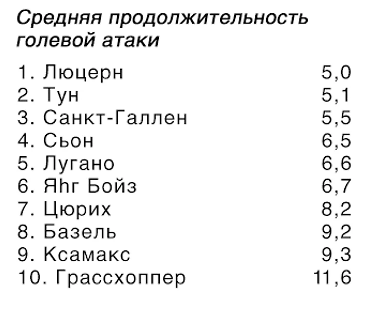 У «Люцерна» средняя продолжительность атак, которые приводят к голу, 5 секунд – это лучший показатель лиги. А также «Люцерн» – единственная команда Суперлиги, которая ещё не забила ни одного гола, владея мячом дольше 20 секунд.