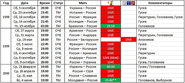 А матч Андорра-Россия точно должен был идти в прямом эфире? Просто в телепрограмме на 8 сентября 1999 года для Москвы была указана именно трансляция в записи в таймслоте 21:40-23:50, хотя сам матч начинался в 20:30, как в таблице (и подтверждение этому - программа для Челябинска, где начало трансляции - в 22:30).