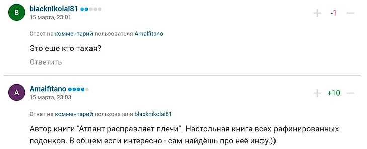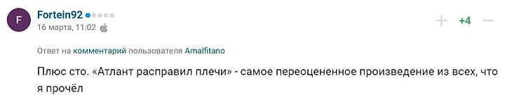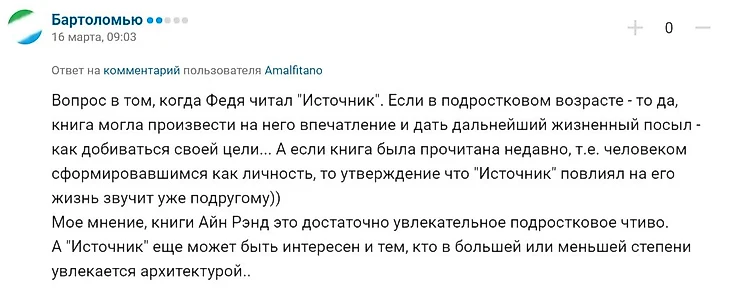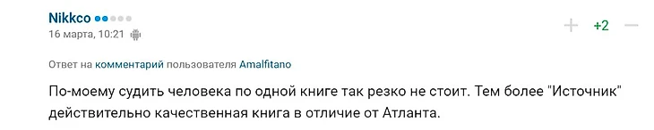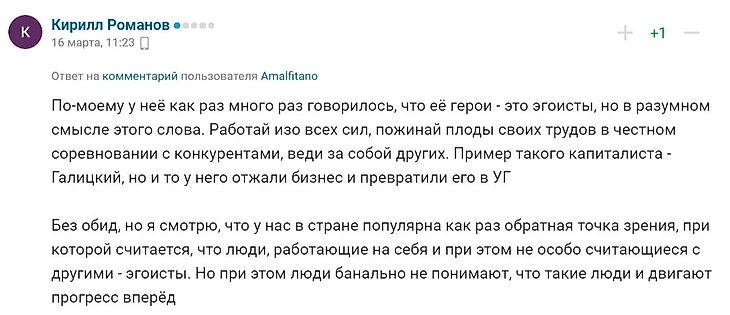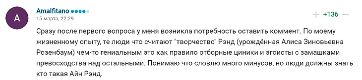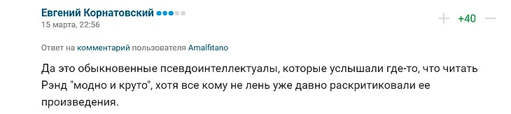 Топовый комментарий пользователя Amalfitano побудил остальных на обсуждение творчества Айн Ренд.