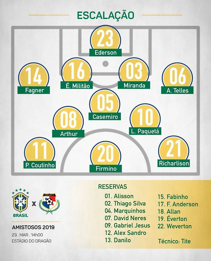 Бразилия Эдерсон Мораес • Алекс Теллес • Миранда • Фагнер • Эдер Милитао • Артур (Фелипе Андерсон, 72) • Ришарлисон • Лукас Пакета (Габриэль Жезус, 60) • Каземиро • Филиппе Коутиньо• Роберто Фирмино (Эвертон Соарес, 60)