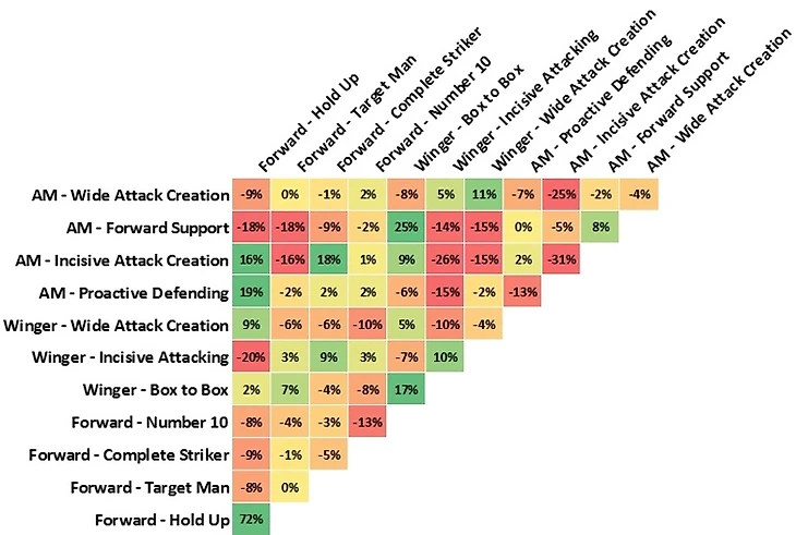 Просчитав данные для каждой позиции, мы получили выгодные и вредные связки для каждого игрового стиля. На следующий таблице мы видим, что атакующий полузащитник стиля «проникающие передачи» имеет выгодную связку с «нападающим в оттяжке» или «нападающим - завершителем, но теряет продуктивность в связке с «нападающим - столбом». Данные обо всех игровых связках можно здесь.