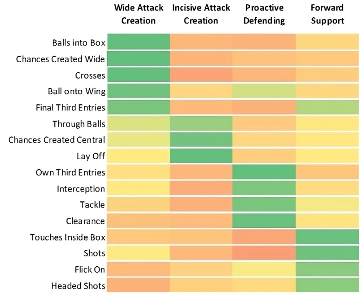 Например, в первой таблице тепловая карта АОК для атакующих полузащитников идентифицировала то, что игроки, делающие больше всего отборов, также делают больше всего перехватов, выносов, но реже наносят удары и делают меньше касаний в штрафной площади соперников. Сгенерированная по основным компонентам таблица дает нам понимание того, что атакующие полузащитники играют в стилях ‘Wide Attack Creation’ (атака по всей ширине), ‘Incisive Attack Creation’ (проникающие передачи), ‘Proactive Defending’ (проактивная оборона) and ‘Forward Support’ (поддержка нападающих). Посмотреть АОК (PCA) для всех позиций можно здесь.