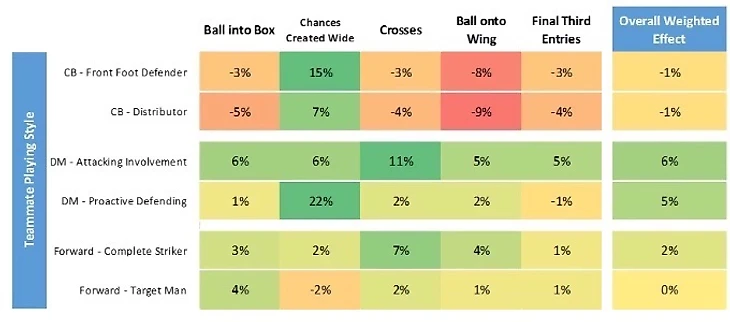 После того, как мы идентифицировали стили для каждой позиции, наш следующий шаг – это понять как они взаимодействуют друг с другом. Мы взяли события, имеющие значение для каждого стиля и провели регрессионный анализ, чтобы проверить как изменилась продуктивность при взаимодействии партнерами по команде, играющих в разных стилях. Из примера, описанного в следующей диаграмме, мы можем сказать, что «атакующий по всей ширине» атакующий «по всей ширине поля» полузащитник приносит на 15% больше возможностей при широком расположении, когда играет с центральным защитником, играющим в стиле «агрессивный защитник» (тот, который агрессивно выбрасывается из линии, всегда старается отобрать или перехватить мяч).