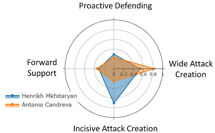 АОК также предоставляет оценку того, насколько определенный игрок подходит под другую манеру игры. Например, на следующей диаграмме мы также можем увидеть иллюстрацию того, что Мхитарян хорошо подходит под стиль «проникающие передачи» в то время, как Кандрева больше подходит под стиль “атака по всей ширине”.