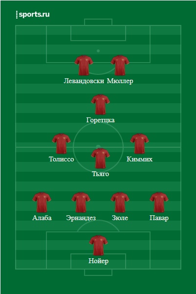 Такой вариант расстановки кажется мне наиболее логичным исходя из имеющихся кадров. Если линия обороны не должна вызывать вопросов, то они обязательно появятся к остальным линиям игроков. Например, Место Корентена может занять Йосуа Киммих, который не раз заявлял, что позиция шестерки является его излюбленной. Возможны замены по позиции: на текущем месте Толиссо Киммих, на месте Тьяго Толиссо и на месте Мюллера Толиссо. В нападении хотелось бы чаще видеть молодых игроков. Например, Дейвиса или Чжон Ву Ена.