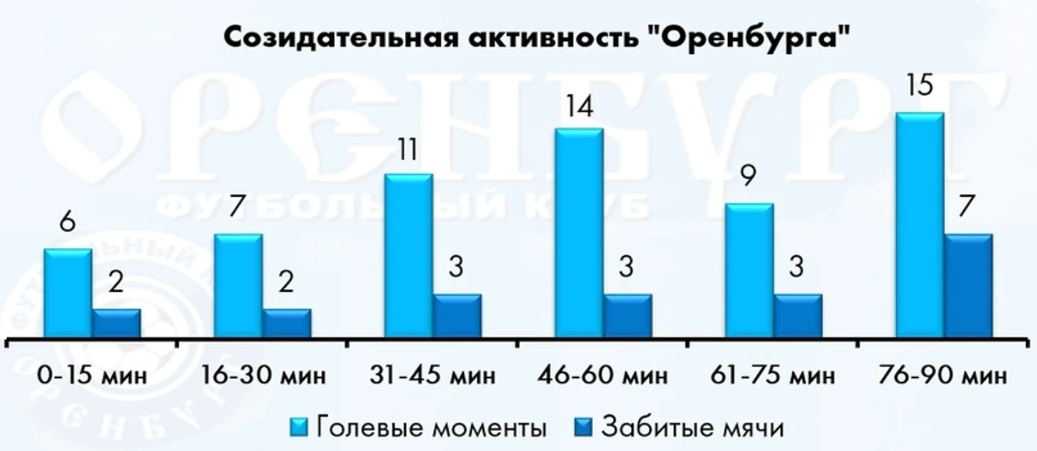 От «Оренбурга» можно ожидать сдержанного начала, но после 30-й минуты команда добавляет в агрессии, если того требует ситуация. Пиковые отрезки активности приходятся на концовки таймов, а несколько решающих голов были забиты в последние 15 минут (победные – «Локомотиву», «Анжи» и «Уфе», сравнивающие – «Арсеналу» и «Краснодару»). Так что и с «физикой», и с характером у команды Федотова тоже полный порядок.