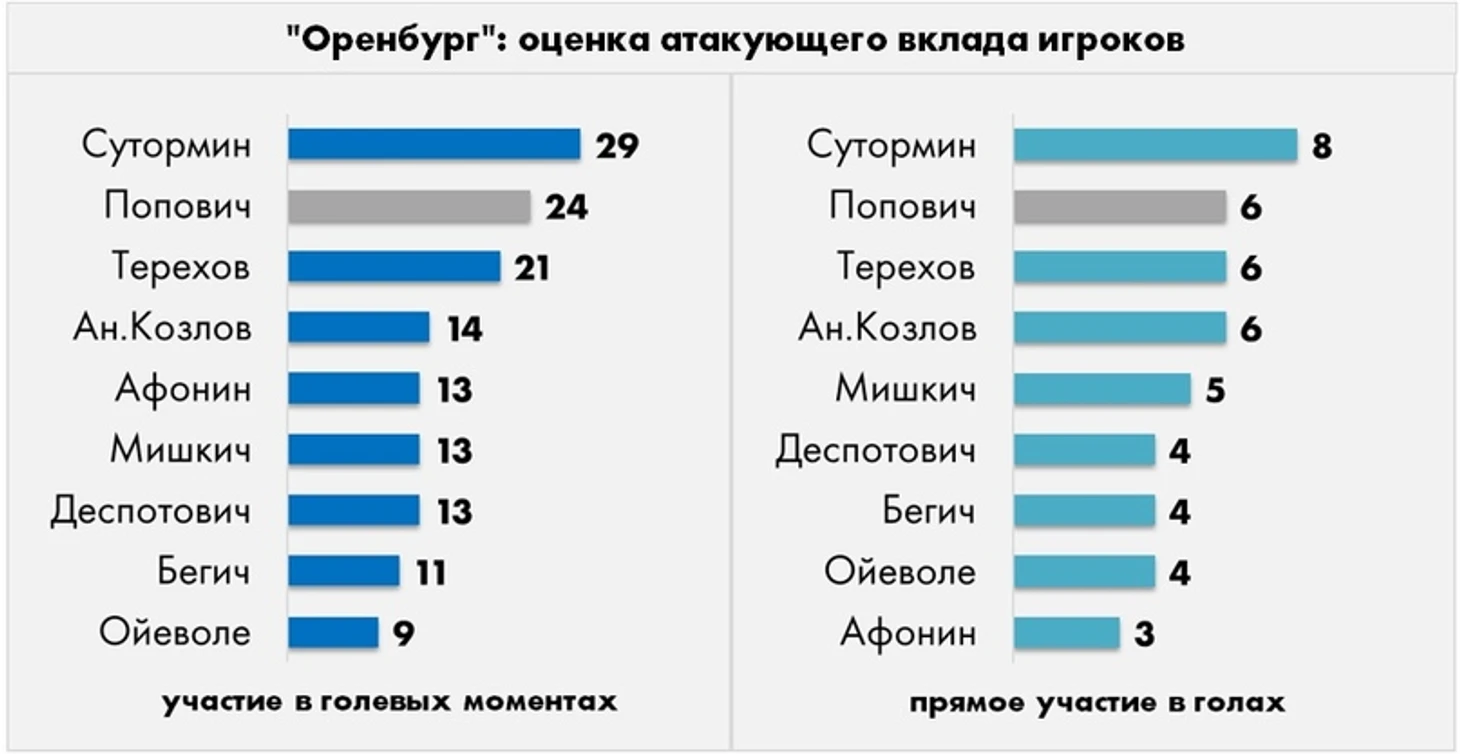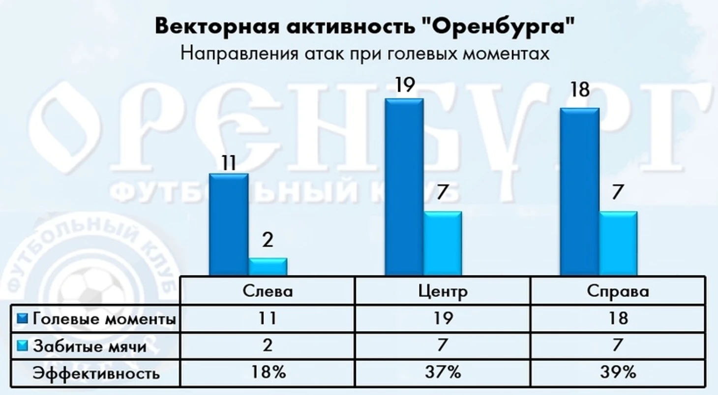 Дополнительный инструмент в атаке «горожан» – высокие подключения левого латераля Терехова в ситуациях, когда «Оренбург» создает «перегруз» на своем правом фланге. Пару голов после таких маневров Сергей уже забил (оба – с передач другого фулбэка Малых), а по числу личных голевых моментов (6) в своей команде он уступает только Сутормину (15) и двум форвардам – Козлову и Деспотовичу (по 8).
