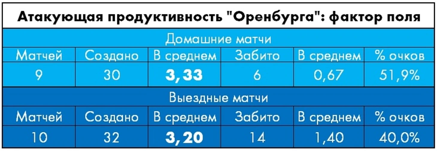 Интересно, что у «Оренбурга» скромная домашняя результативность (6 мячей – последнее место в лиге), но в гостях команда Федотова забивает по меркам РПЛ очень много (14 мячей – больше только у «Краснодара»). Настоящая статистическая аномалия с учетом того, что и по количеству, и по качеству созданного показатели «горожан» дома и на выезде практически идентичны.