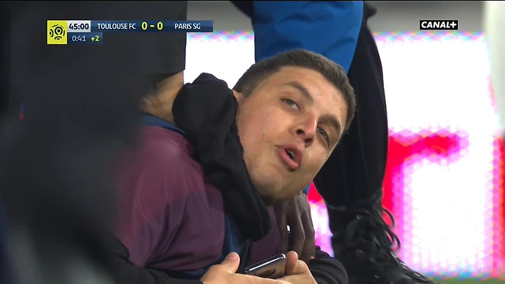 В компенсированное к первому тайму время на поле прорвался болельщик «ПСЖ». Молодой человек направился к нападающему парижан Килиану Мбаппе, чтобы сделать с ним селфи.