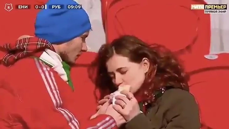 Футбольные баталии 21 тура затмил эпизод в матче «Енисей»-«Рубин»: в кадр попали трибуны, где молодой человек поделился с девушкой самым дорогим- шавермой.