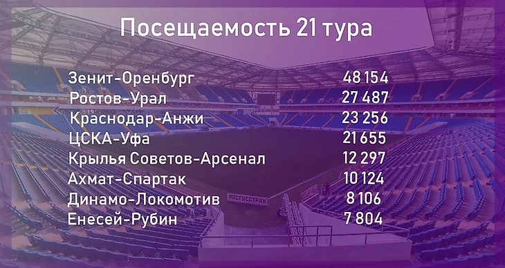 В 21 туре радует посещаемость на стадионах: в среднем на играх присутствовало 19000 зрителей. Это на 8000 больше, чем в прошлом туре.