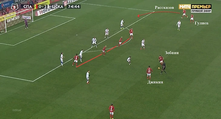 Где-то за 20 минут до окончания матча «Спартак» старался просто перегружать линию обороны ЦСКА, создавая 5-в-5. Очень высоко поднимались центральные защитники хозяев (особенно Джикия), а Зобнин и Гулиев поочередно подключались через полуфланги или даже фланги.