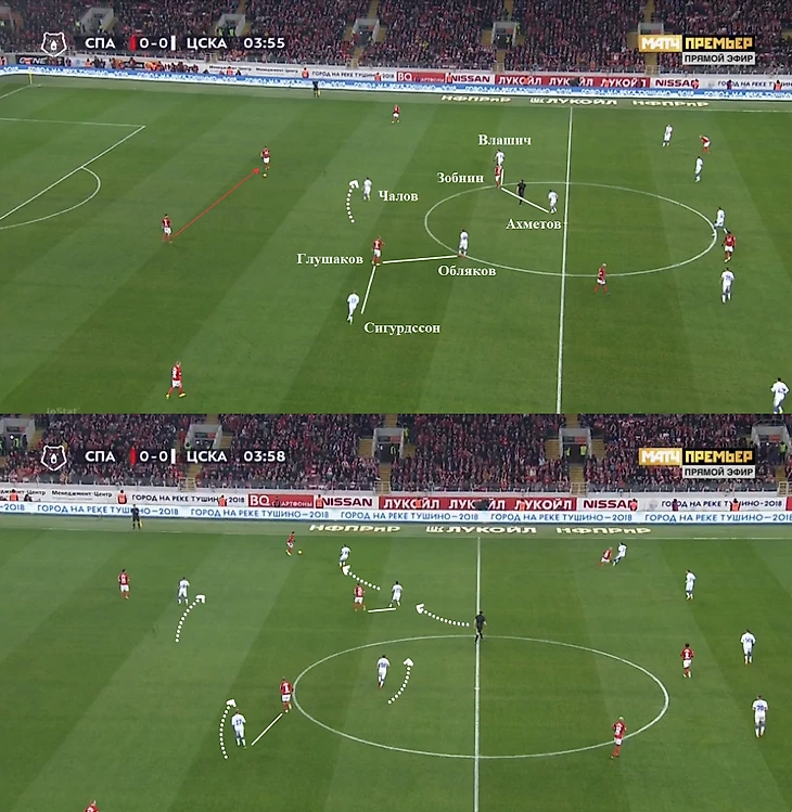 В первом тайме подобный прессинг «армейцев» зачастую проваливался. Например, несколько раз передачи на смещавшегося чуть глубже Зобнина разбивали прессингующий пятиугольник Гончаренко – Чалову не удавалось перекрывать линию передач (и вряд ли он теоретически мог), Влашич грамотно переключался на крайнего защитника, а вот Ахметов не понимал, контролировать ли ему возможную передачу между линий на Ханни или поджимать Романа. При глубокой обороне Ильзат часто опускался чуть ниже, чем его партнеры по линии обороны, чтобы контролировать потенциальный пас на Ханни между линий, поэтому в ситуациях с фланговыми ловушками ему было не так просто принять решения.