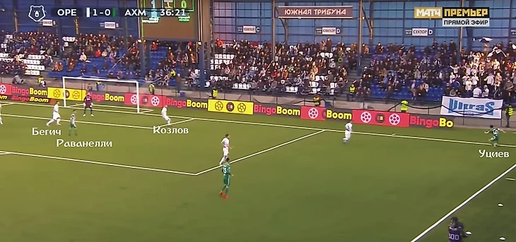 Полагаю, что менталитет Уциева заставил его активнее действовать в атаке под влиянием чувства вины. Как никак в Чечне с коренного чеченца спрос особый. Уциев и начал первую голевую атаку "Ахмата". Видим, что Раванелли стоит один. И та же дилемма центральных защитников - играть строго или играть по уму. Выбрали оренбуржцы первое. Бегич должен был выдвинуться на Раванелли, но остался стоять.