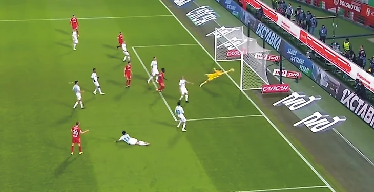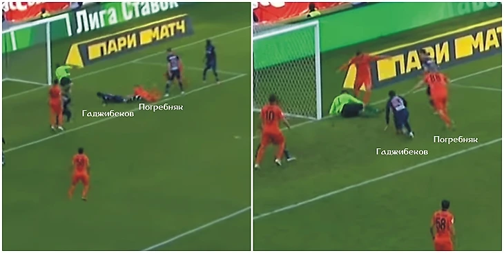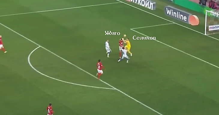 Первый гол сообразили на двоих Жиго и Селихов. Во-первых, Селихову не стоило лезть в борьбу с тремя игроками, тем более что Жиго мяч контролировал. Фактически Селихов сбил своего защитника, и вина в большей части на нём. Но нельзя не учесть и часть вины француза, который должен уступать вратарю, коли тот уж вышел из ворот. Может быть, Селихов кричал, как следует в такой ситуации. Может, нет. Однако недопонимание между одноклубниками налицо.