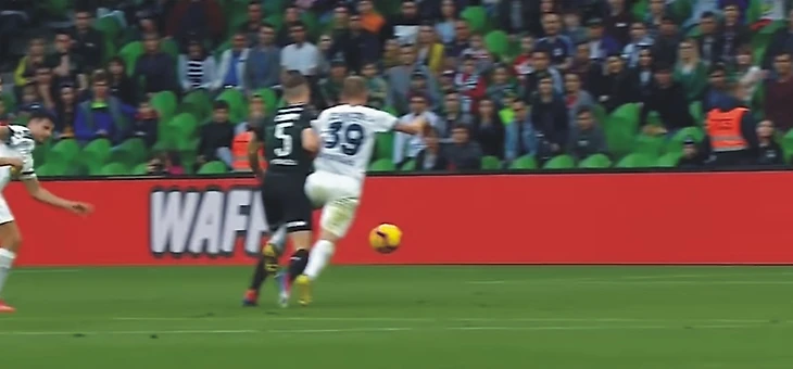 Единственный гол в добавленное время забил Классон с пенальти. На кадре видим, как Денисов фактически сбивает Спаича, просовывая тому ногу куда не следовало бы. Вот он и виноват.