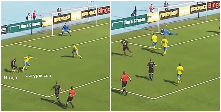 Единственный гол забил Игбун. Получив мяч на фланге, он, не стесняясь, двинулся к воротам. Как ребёнка обыграл Сиггурдссона и, не думая особо, дал в ближний угол, что для Песьякова стало настоящим сюрпризом.