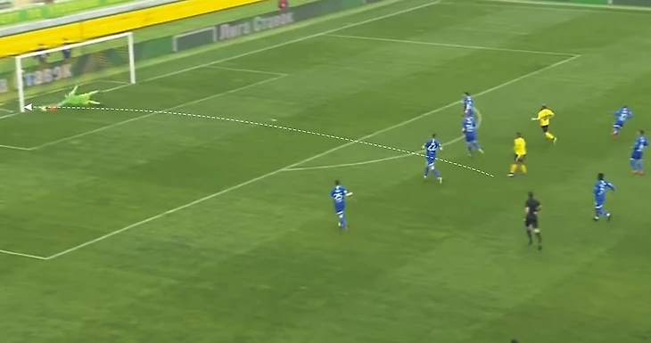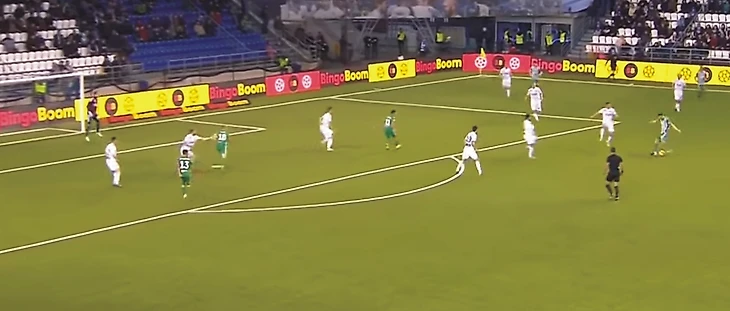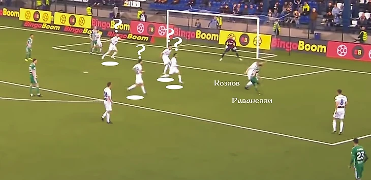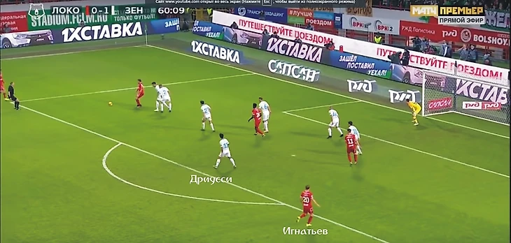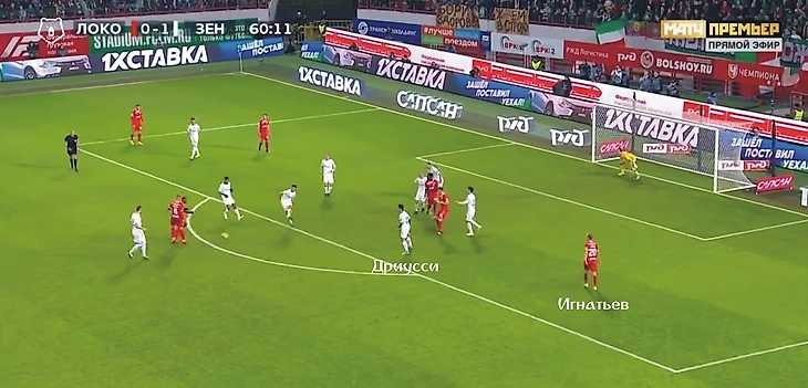 "Локо" сравнял счёт после банальной ошибки Дриусси. Видим, что "Зенит" ровно выстроился, как полагается. При такой расстановке крайние полузащитники обороняющейся команды следят за крайними защитниками атакующей, но только не Дриусси.