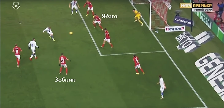 Зобнин или Жиго должны бы покрутить головой и найти Сигурдссона. При этом Глушаков совершенно забыл Влашича и свою позицию. Какой он молодец! В такой ситуации один центральный защитник должен выдвинуться на принимающего, хотя это не соответствует канонам нынешней игры защитников, мне решительно непонятно, почему в любой ситуации пара центральных защитников всегда намертво держит линию. В таких случаях проблема в опорной зоне сразу оборачивается опасной ситуацией.