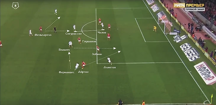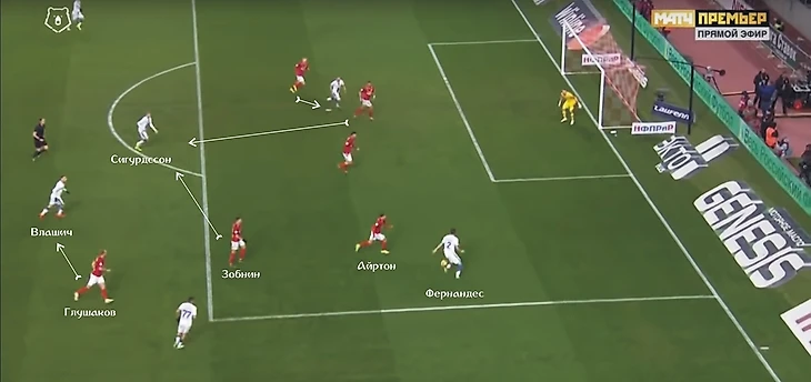 Второй гол армейцы организовали, воспользовавшись слабостями "Спартака". Видим, как Фернандес играет в "стеночку" с Влашичем и получает мяч в свободную зону. При этом Сигурдссон отошёл в опорную зону, которая оказывается открытой, так как Зобнин страхует фланг, а Глушаков сместился к Влашичу.