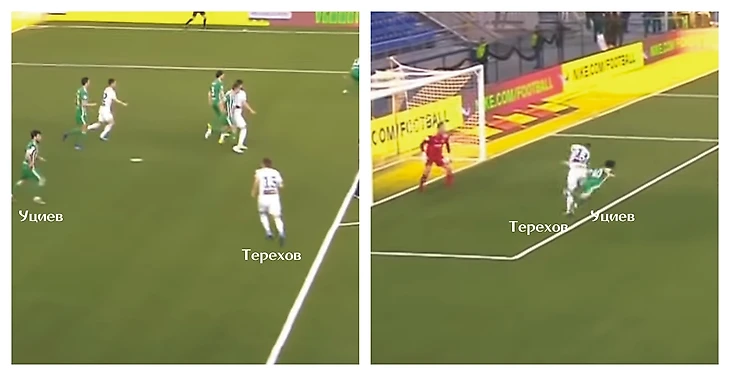Оренбуржцы первым открыли счёт. Видим, как Терехов готовится рвануть и принять мяч на дальней штанге после подачи, а Уциев уже посматривает на него. Однако справиться Уциеву это не помогает. Терехов выиграл борьбу и забил гол.