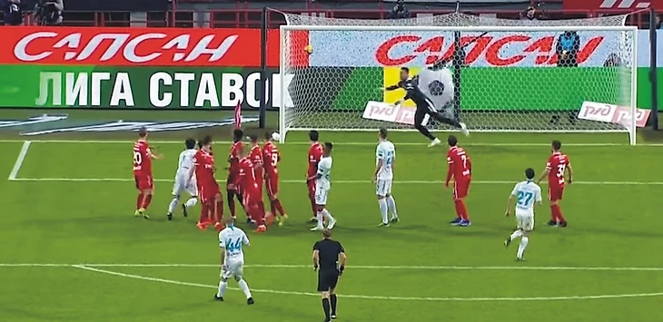 Игнатьев тоже "молодец". Увы, он не Эшли Янг и даже не Серхио Регилон. Он довольно долго возится с мячом и решает отдать пас в центр, что при насыщенной обороне "Зенита" только в том случае эффективно, если ты отдаёшь мяч как минимум Квальярелле. Но понесшийся исправляться Дриусси помогает Игнатьеву, и мяч рикошетом летит в ближний угол. Дриусси балл за эпизод.