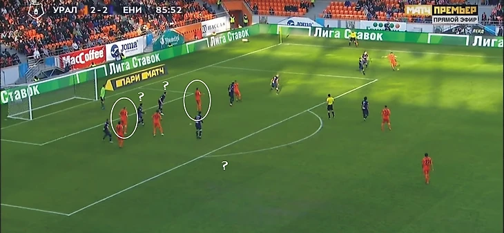 Второй гол - следствие анархии в обороне красноярцев. Во-первых, после подачи с фланга перед вратарём оказалось больше игроков "Урала", чем "Енисея".