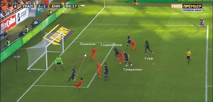 Теперь Гаджибеков играл против Бикфалви, а Грицаенко против Панюкова. Грицаенко оказался на мяче первым, Панюков же, увидев, что борьбу ему не выиграть, сразу двинулся к дальней штанге и не прогадал. Отскочивший к Эль-Кабиру мяч он отправил в ворота без помех. Грицаенко не вернулся к Панюкову, а Гаджибеков его не подстраховал, хотя после отскока оказался ближе к Панюкову, чем Грицаенко. Вина на на паре горе-защитников "Енисея". Ещё восемь матчей им мучаться.