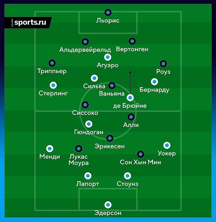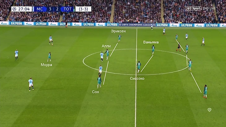 Обычно «Сити» не оставляет таких дыр в прессинге. Но вчера команда оборонялась не в самых удобных 4-3-2-1 и, видимо, слегка опасалась преимущества «Тоттенхэма» в центральной зоне. Получая мяч, Ваньяма почти не пользовался свободой для продвижения мяча (не тот тип игрока), но гости сохраняли владение и получали дополнительные передышки.